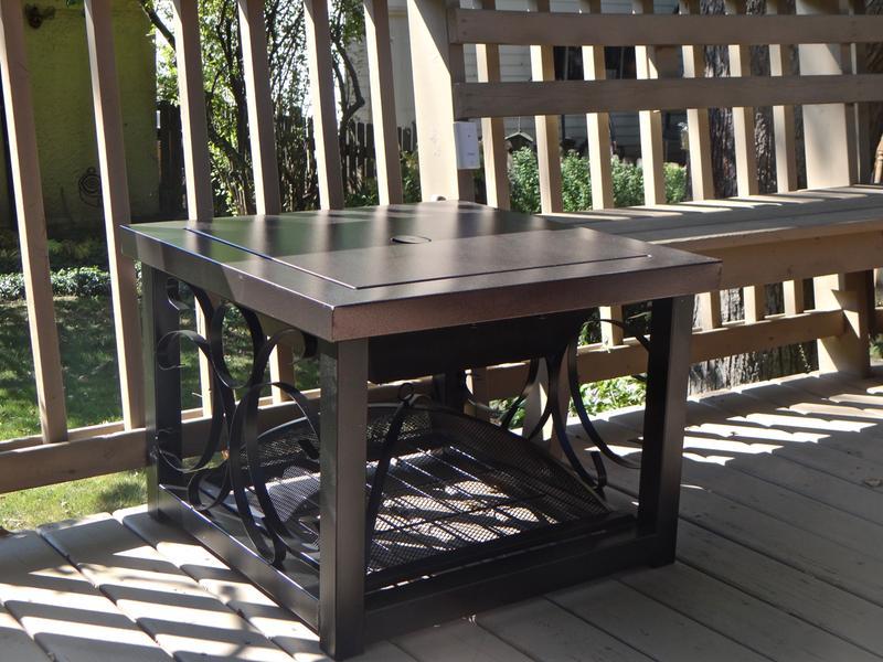 It includes a table lid that transforms the fire pit into an accent table. Well traveled 61331 hammer tone bronze finish cocktail table fire pit. Spots to sip drinks and cozy up by a fire in boise. It is easy to replace the propane tanks. Perfect for outdoor entertaining, this hammered bronze finish table top patio heater provides warmth while adding ambiance to any outdoor table top setting. Constructed of sturdy high grade steel plated in our attractive hammer tone bronze finish, this durable fire pit table features a large fire box and a lower log storage rack. This decorative fire pit doubles as an attractive cocktail table. Constructed of sturdy high grade steel plated in our unique hammer tone bronze finish, this the steel cover easily converts this fire pit into the perfect cocktail table companion to any patio furniture grouping. Its grey neutral tone pairs with most patio sets. Hammer tone bronze finish cocktail table fire pit. Removable lid, outdoor use only. The square pit is surrounded by a bronze finished surface, there is decorative iron work on sides, the the hammer tone surface is designed to be durable and the metal on the screen is protected there is a lot of talk about the good looks of this firepit/table but there are a few reviewers warning that summary: H rectangular powder coated steel lp fire pit coffee table in faux wood with lava rocks.